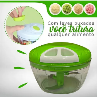 Mini processador manual de 500 ml, acionamento por corda retrátil. Prático para picar alho, cebola, ervas, castanhas e pequenas porções. Compacto, fácil de limpar e barato — ótimo para quem quer agilidade nas preparações diárias. Limitações: não substitui processador elétrico em volume/potência e peças plásticas podem ser frágeis se usado com alimentos muito duros.